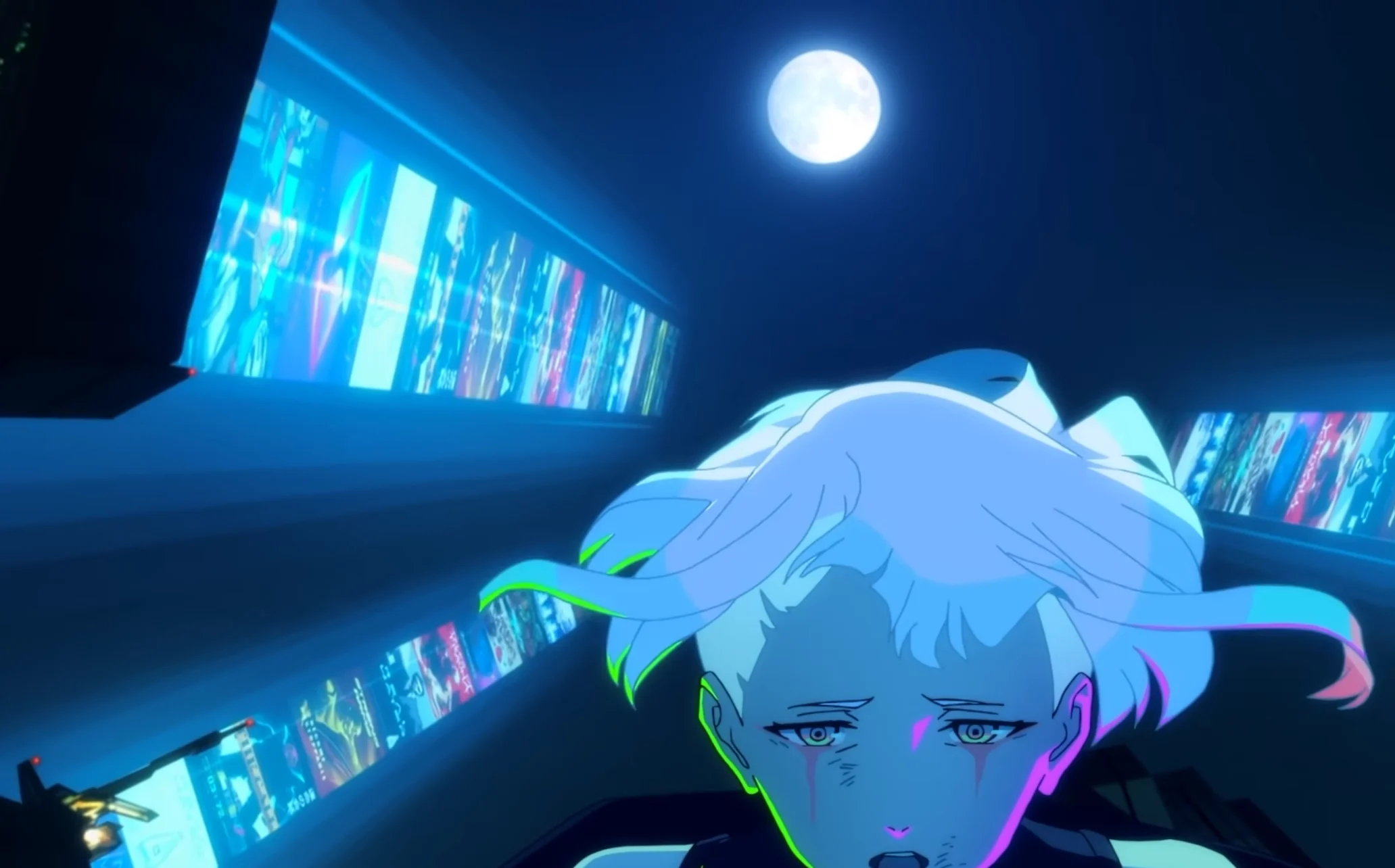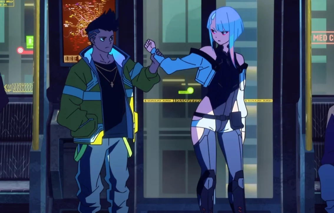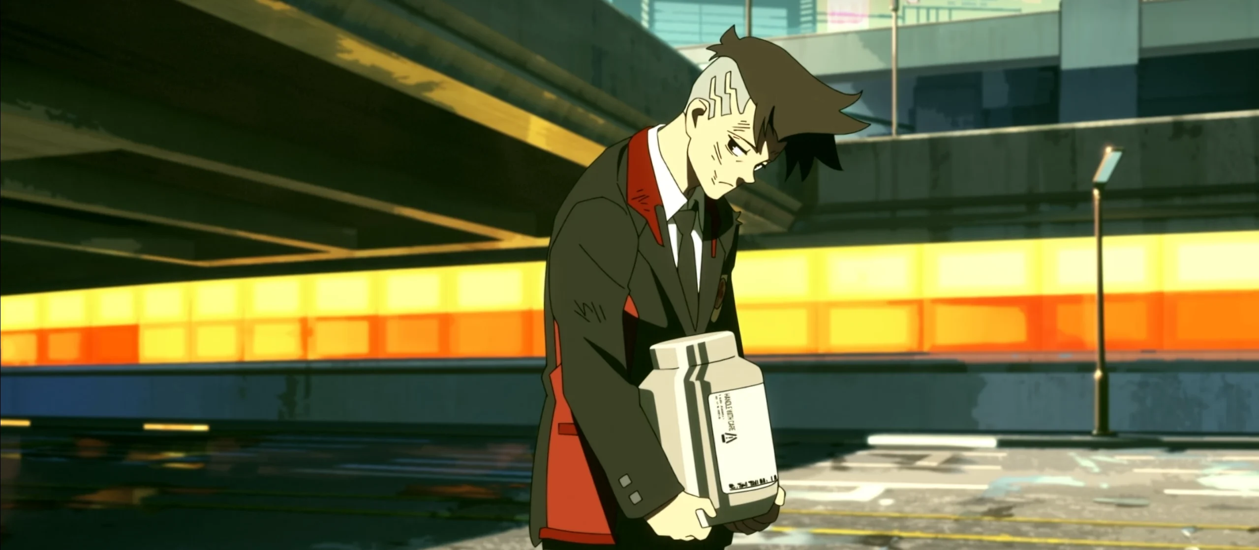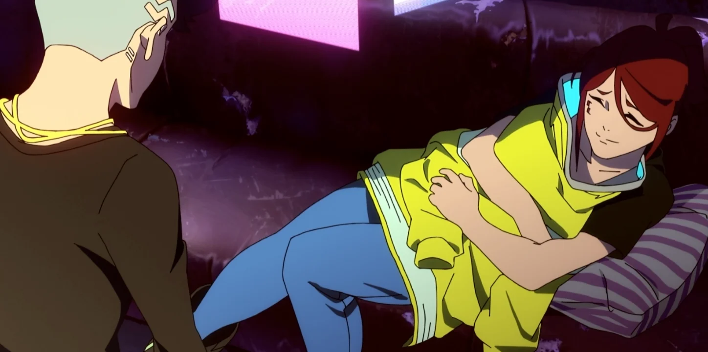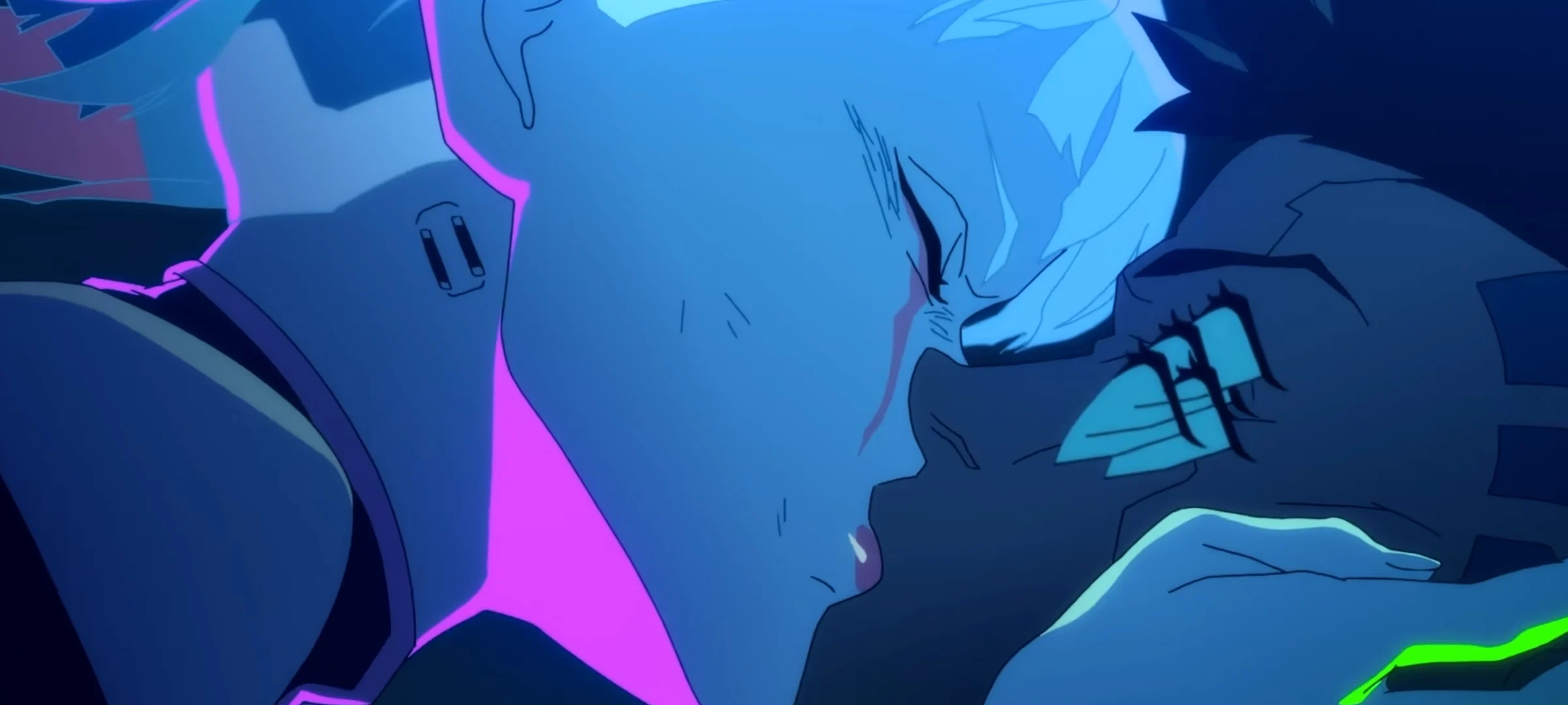 大卫有着很强的行动力吗,时刻告诉自己一定要去做什么,也确实是个不知疲倦从未停下的人,但是从始至终都在被别人赋予动机,别人的梦想驱动,他穿上那件黄马甲就变成了母亲,在衣服刻上了Logo就变成了边缘行者装上了曼恩的手臂就变成了曼恩,装上了义体金刚就变成了疯狂,更不用说从始至终和露西一起登月的梦想,在赛博朋克这个世界大染缸里面,被染上了一层又一层后,最终融化在了这个城市的无垠的夜里,这个特质成为了大卫今后的所有行为的底层代码或者逻辑,再用斯安维斯坦把侮辱母亲的权贵同学胖揍了一顿后,悲伤化为的愤怒已经燃烧殆尽,然后呢?大卫心想?然后那道白月光不偏不倚的照进了大卫的生命中。